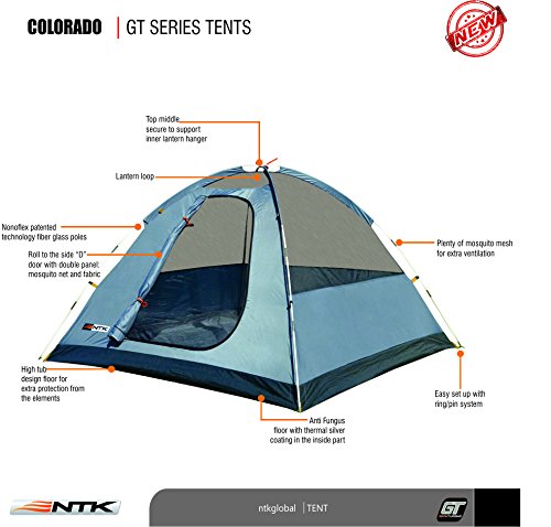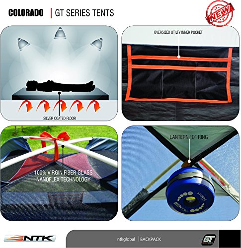 THICK NANO-FLEX TECHNOLOGY FRAME – Extra thick Nano-flex fiberglass poles interconnect with double gold chrome plated ferrule hardware and strong elastic, offering a sturdy construction. Made with 100% virgin material to provide additional strength and flexibility. The high-performance NTK outdoor camping tent also has a pin-and-ring system for fast and easy setup.