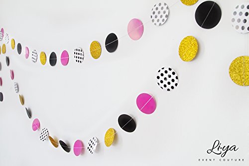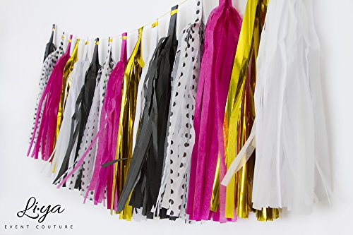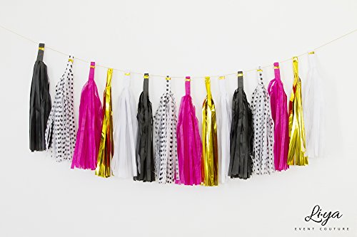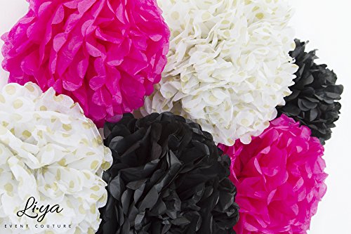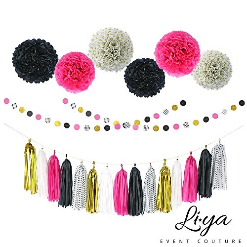 Li★ya Party Decorations - 15 Tassels, 6 Paper Pom Poms, 2 Circle Garlands; perfect for Bridal Showers, Bachelorette, Wedding and Birthday Parties; Pink, Gold, Black, White, Polka Dots