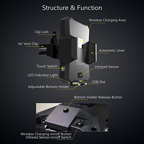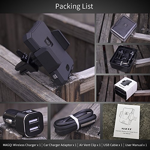-. Feature : ONE HAND OPERATION: Put your phone on the mount and get it wireless charged simply with one hand. It makes GPS, phone call and check message more convenient and safe. Also, you will feel how amazing this mount is when you hear the sound made by the levers opening and closing automatically. Protect yourself and bring your driving experience to the next level- this MAGQI automatic phone holder is just what you need! / FULLY AUTOMATIC: The most advance infrared induction tech: the lever will open and close automatically once your phone approach. Touch the on-off button on left side ,the clips automatically open, take your phone out. The system will shut the sensor off if the clips open without phone on it once, touch the button on the left or restart the car engine can recover it. You can turn off the wireless charging by pressing the button on the back when you just want to use MAGQI simply as a car mount. / AIR VENT MOUNT: Compared with windshield or dashboard mount, the air vent mount is much easier for you to reach the phone in the car and causes less distraction during driving. Moreover, the car air conditioner can cool the charger down in summer while you can switch the conditioner with charger off in winter. 360 degree rotation & support both horizontal and vertical view. / QI WIRELESS CHARGE: The MAGQI JINDSMART is compatible with all Qi enabled devices such as Samsung Galaxy S9 S9 Plus S8 S7/S7 Edge Note 8 5 iPhone X 8/8 Plus and so on with standard 5V/1A output. Other phones such as iPhone 5,6,7 need extra Qi receiver patch to get it work. With cases (not metal) between 2-4mm on the phone, MAGQI can work without any problem. / DUAL USB CAR CHARGER: Comes with a 1m micro USB cable and a dual car charger for MAGQI wireless car mount, which provides the flexibility to charge a secondary device. We would highly sest you to use the the high quality dual car charger and USB cable comes with the product in your car.