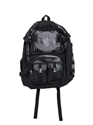 Product Description Become the Batman. This Batman: Arkham built-up utility backpack is inspired by Bruce Wayne's famous Bat-Suit. 2 front buckle pockets, 2 front zipper pockets, utility straps, 2 water bottle pockets. Main zipper pocket with tech sleeve, padded back and adjustable padded straps. 12" x 17" PU/polyester 0