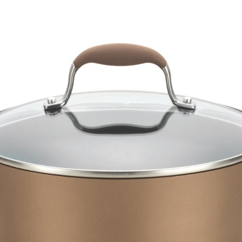 -. Feature : Hard-Anodized construction provides efficient, even heat distribution; elegant tulip profile with distinctive bronze exteriors and chocolate interiors / Premium-Quality, restaurant-tested PFOA-free nonstick is long lasting and metal utensil safe with superior food release and effortless cleanup / Shatter-Resistant glass lids retain heat and moisture during cooking; oven safe to 400 degrees Fahrenheit / Lifetime warranty / The cookware's Angolan Sure Grip handles offer solid, comfortable grasp and are dual riveted for strength