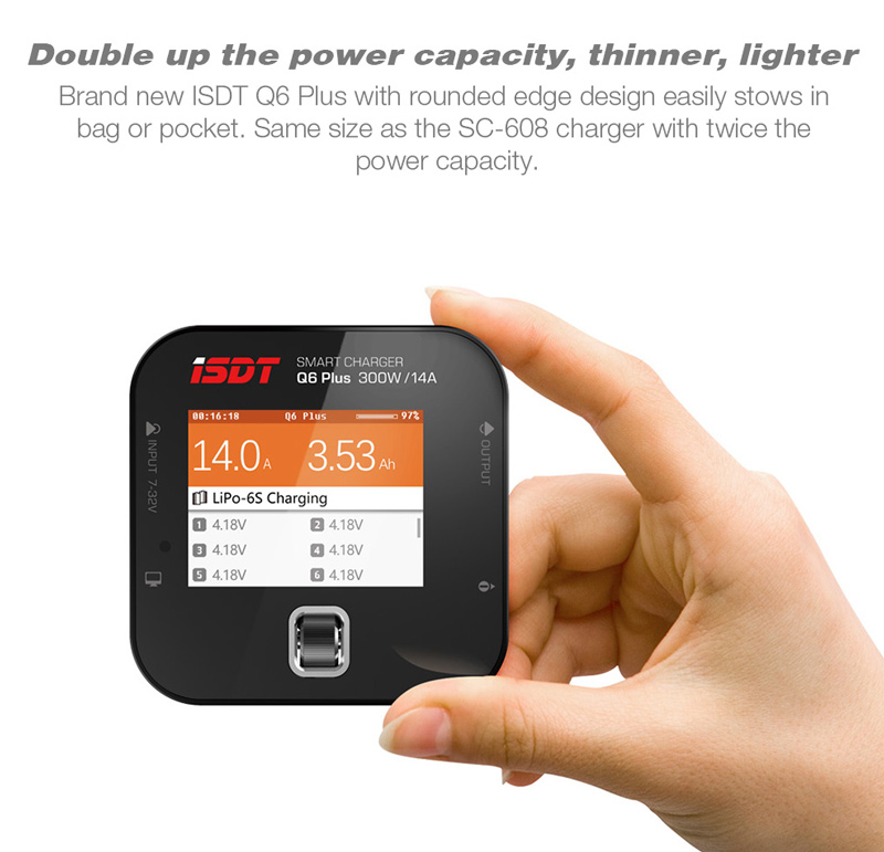 Brand new ISDT Q6 Plus with rounded edge design easily stows in bag or pocket. Same size as the SC-608 charger with twice the power capacity.