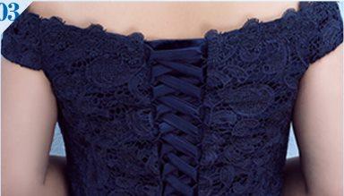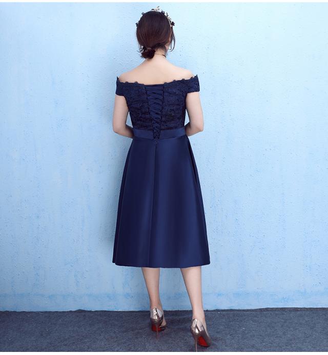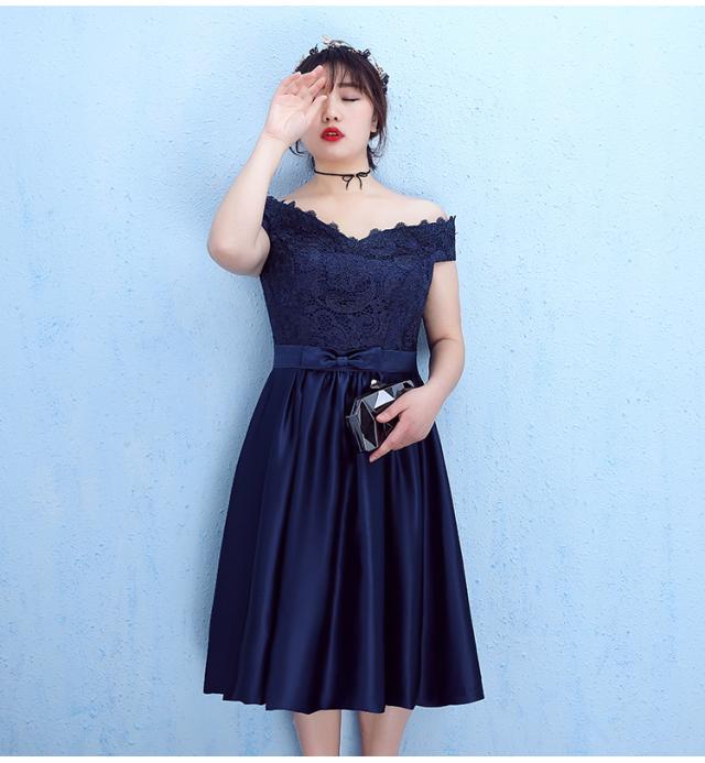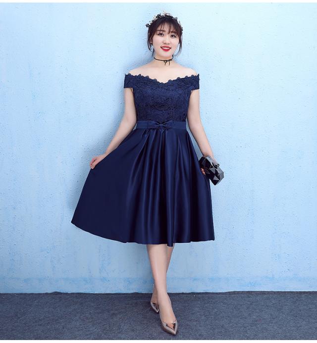 オフショルダー 刺繍 リボン 膝丈 パーティードレス 結婚式 披露宴 二次会 ステージ パーティー 演奏会 コンサート 発表会 ネイビー 大きいサイズ 体型カバー 調節可能 着痩せ XL 2XL 3XL 4XL 5XL 足長効果 キャバ お呼ばれ スピンドル レースアップ