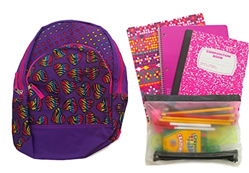 -. Title : Backpack for Girls Rainbow Heart - School Supplies Kit - Notebook - Composition Book - Pencil Case - Pens - Pencils - Crayola Crayons - Ruler - Folder