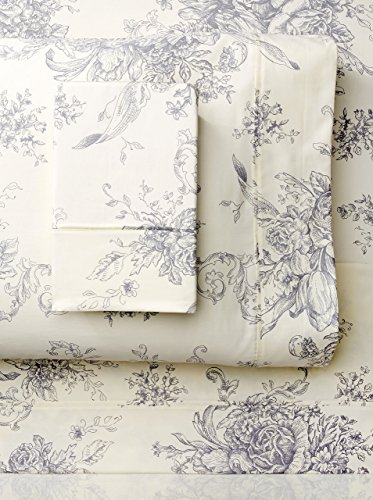 Melange Home Flannel Sheet Set Toile Printed Cotton, King, Grey/Off White, 4 Piece