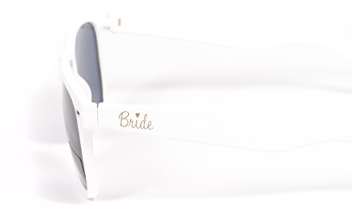 IMPRINTED at the temples in stylish script. Bridesmaid glasses are imprinted with “Bride Tribe” in white, fade-resistant ink. White sunglasses feature the word “Bride” printed in gold script.