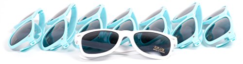 8 PIECE SET features 7 turquoise blue bridesmaid sunglasses and 1 white pair of bride sunglasses, ideal for your bachelorette party, bridal shower or as wedding photo props for your portraits.