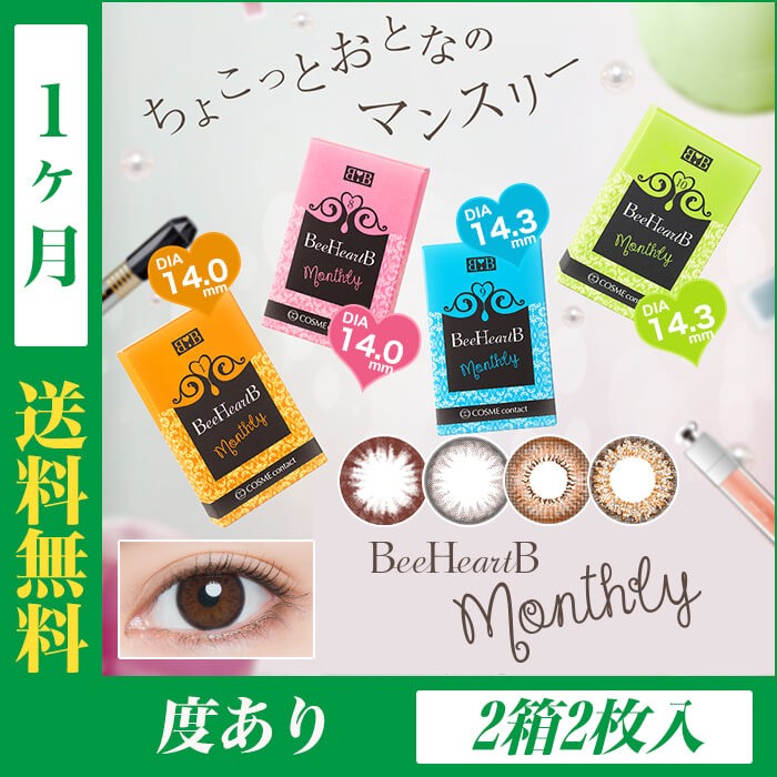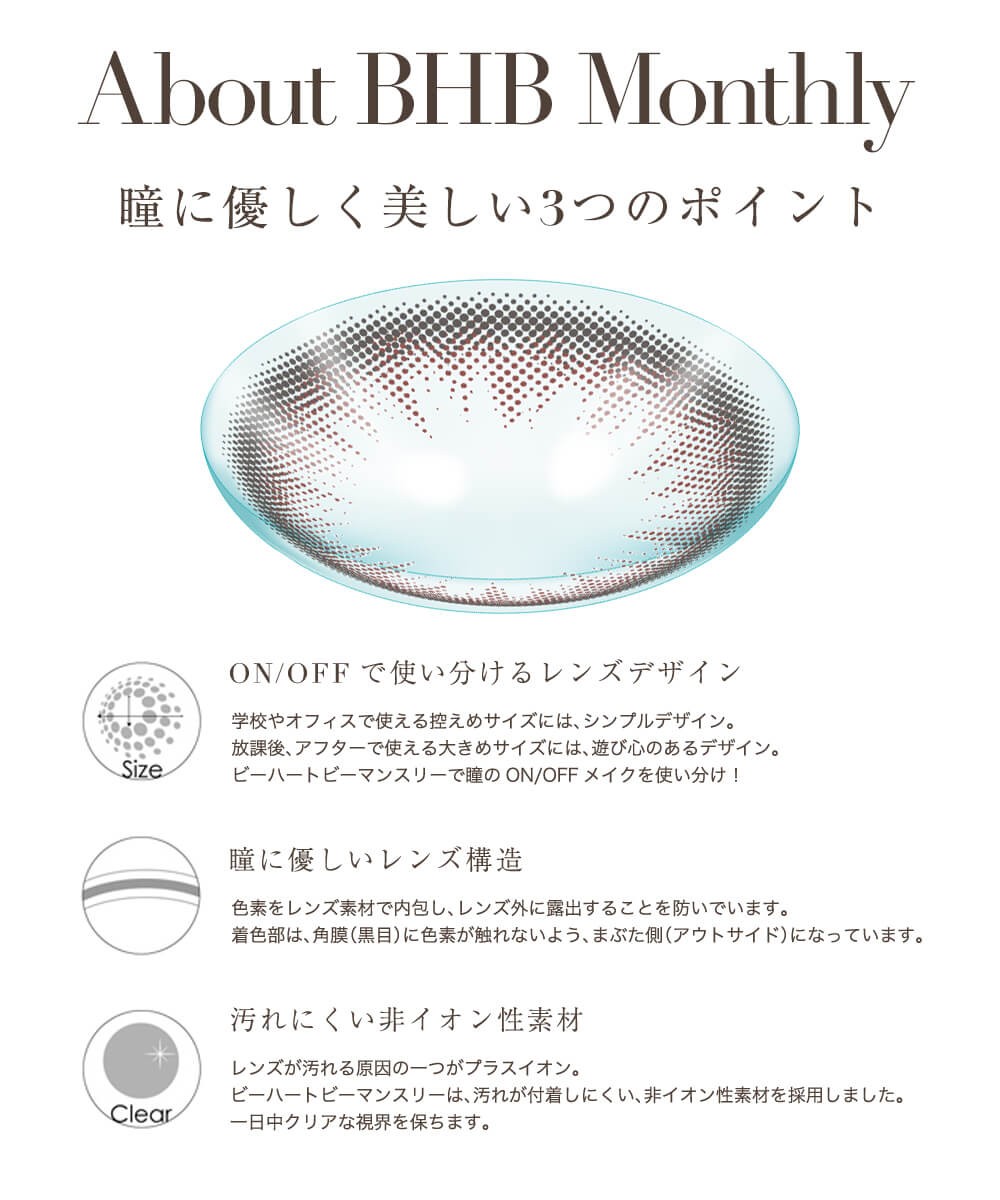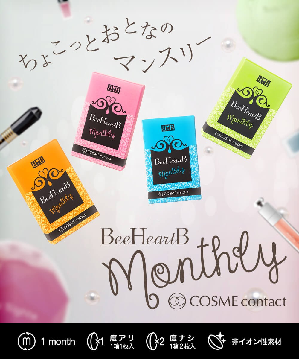 | 特徴 | ちょこっとおとなのマンスリー 日本人女性が持つ瞳の魅力を惹きだすBeeHeartB(ビーハートビー)から、 マンスリータイプのBeeHeartB monthly(ビーハートビーマンスリー)が登場しました。 大きく見せるだけの瞳は卒業しよう! おとなっぽくランクアップしたいなら、"洗練された瞳"がポイント。 BeeHeartB monthlyは、瞳を少しだけサイズアップして自然に大きく、 魅力的で美しいまなざしをつくります。 毎日のメイクのようにシーンや気分に合わせて楽しめる レンズデザインにこだわった、気軽に楽しめるコスメコンタクトです。 |