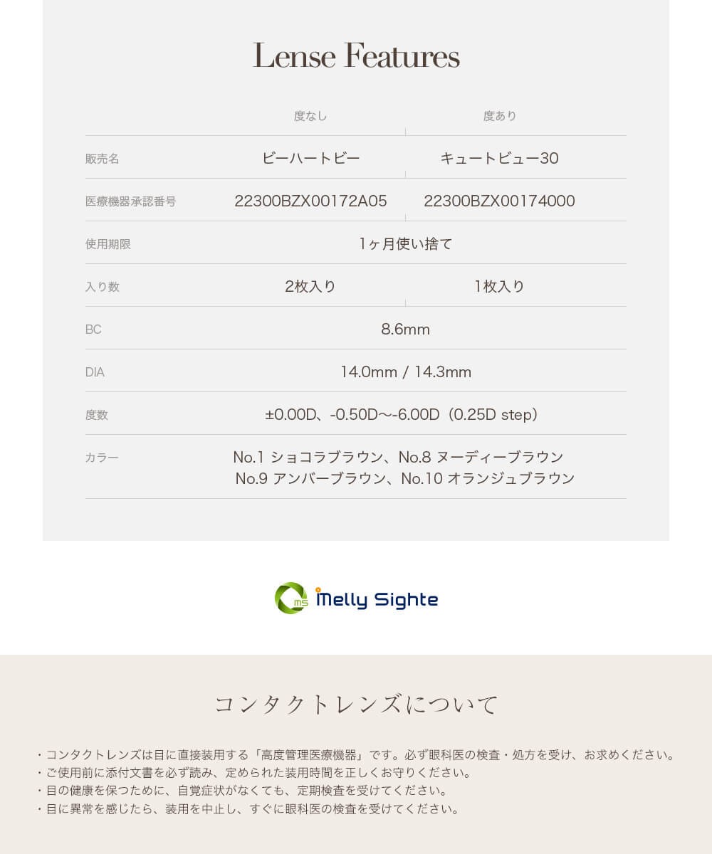 | 使用上の注意 | ★1日の装着時間は8時間以内 ★当品の乾燥にはご注意下さい。もし装用中に目の乾燥が感じられた場合はソフトコンタクトレンズ用の目薬をご使用下さい。 ★使用後は毎回必ず洗浄及び消毒を行って下さい。 ★眼に異常を感じた時は直ちに使用を中止し眼科医の検診をお受け下さい。 ★初めてご購入される場合は、必ず医師の処方の上、ご自身に適したレンズをお選び下さい。 ★ご使用の際は、取扱説明書をよく読み、清潔な状態でご使用下さい。 |