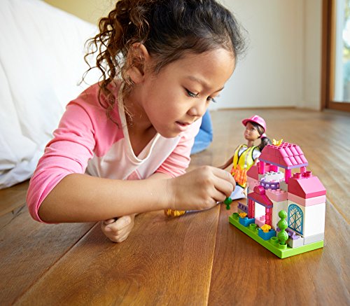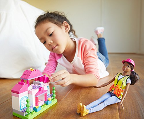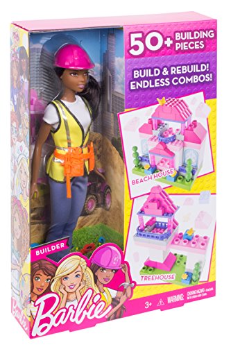 Build big dreams with the Barbie builder dolls and play sets -- they come building bricks with endless possibilities for creation! More than 50 micro- and mini- Mega Bloks Compatibuild bricks in each set can be used to create two pre-designed builds -- a house or a treehouse -- or to build your own creations. Barbie doll is ready to bring her dream structures to life wearing blue jeans, a t-shirt with yellow vest and boots. A pink hardhat and orange tool belt make the perfect career accessories. Each sold separately, subject to availability. Colors and decorations may vary.Feature