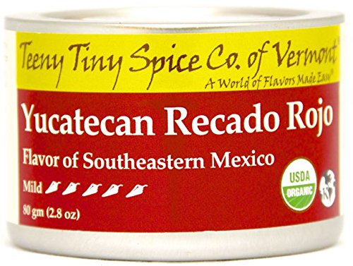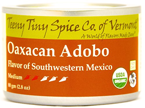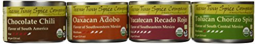 -. Feature : A wide range of spice blends representing Mexican cuisine: Yucatecan Recado Rojo, Oaxacan Adobo, Tolucan Chorizo Spice, Chocolate Chili / USDA Certified Organic, EarthKosher Certified Kosher, Non-GMO, Gluten Free / Mild to Hot / Four Full Sized 80 gm (2.8 oz) Tins of Teeny Tiny Spice Co. of Vermont Spice Blends / Freshly blended, ground and packaged by a small, family operated business