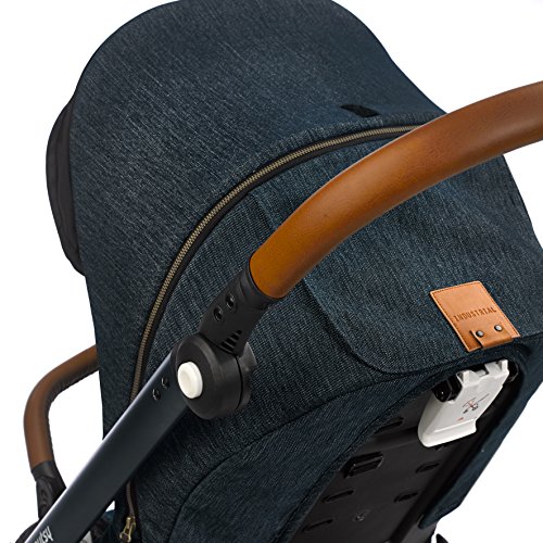 -. Feature : Denim fabrics and aluminum frame make the evo industrial edition sturdy, stylish and lightweight / Full size seat is reversible and now can recline 165 degrees to a position suitable for newborns, due to an added leg rest barrier / Suspension system and ball bearings on all wheels for a super smooth ride, with front wheels that can swivel 360 degrees, or be locked in place / Extra large canopy with viewing window and height adjustable leatherette handle for comfort / Adjustable leg and footrest make the stroller more comfortable for your child as they grow