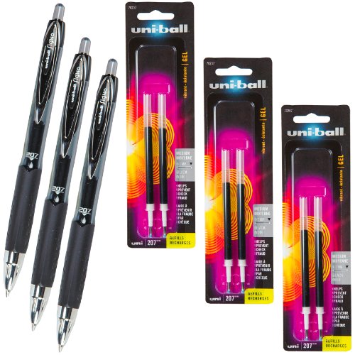 Deal includes: 3 Ea 33950 Uniball Signo 207 0.7mm medium point black gel ink rolleball pens and 3 packs 70207 refills, with 2 refills per pack.