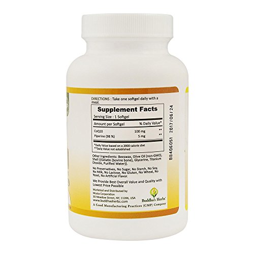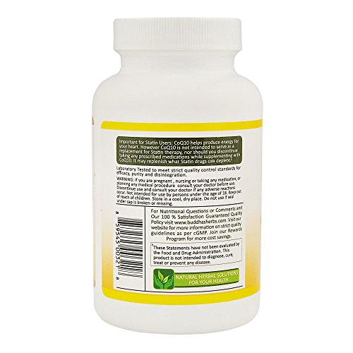 Coenzyme Q10 is a vitamin-like compound also called ubiquinone. It is an essential component of cells and is involved in the production of ATP (Coenzyme used as energy carrier in the cells). Produced by 100 % natural yeast fermentation process, Buddha's Herbs Coq10 Softgels are manufactured at a facility certified for GMP by American Natural Products Association and is formulated for enhanced bio availability. It contains Piperine (98%) for enhanced bio availability and is SOY FREE. It uses Virgin Olive Oil as carrier oil. All operations from procurement of raw material to manufacturing and distribution are GMP compliant. The product undergoes independent testing from a NSF Lab for efficacy, purity and proper disintegration and comes with 100 percent Satisfaction Guarantee. The Certificate of Analysis corresponds to the lot number specified on each product and is Independently verified. Most of the leading brands in the market comply with FDA allowed limits of lead up to 3 ppm per daily serving whereas California Proposition 65 and Consumer Lab (an Independent and Reputable Testing Organization) caps the allowed limit of lead to 0.5 ppm per Daily serving. Buddhas Herbs Coq10 is specially purified for lead, keeping it below 0.1 ppm per Daily Serving where it usually is undetectable, making the product virtually Lead-Free. Buddhas Herbs Coq10 100 mg is also tested by CONSUMER LAB, an independent Dietary Supplement Testing Organization and is listed among list of its APPROVED PRODUCTS. As per Consumer Lab ;Buddha Herbs Coq10 has met Consumer Lab standards for Ingredient and Product Quality in Independent Testing.Feature