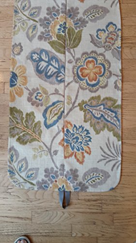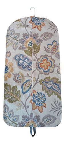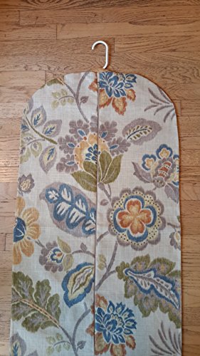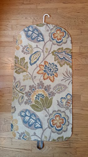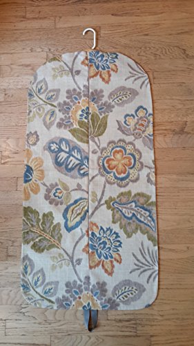 Product Description Ladies hanging garment bag in a beige, taupe, green ,gold and blue floral. It is very pretty and very popular! Made of 100 percent cotton and zips up the front with a grosgrain loop at the bottom. Cold water wash and hang to dry or dry clean. Great gift! One of my favorites! It can hold 3-5 garments or dresses and can be carried on the plane! 0