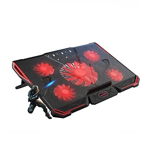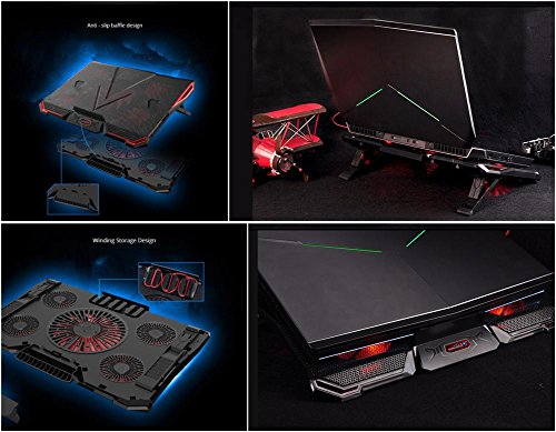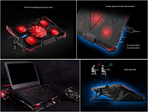 -. Feature : Five-core Depth Cooling: With 1 big and 4 small senior high speed fan, five core depth cooling, multi-directional heat dissipation, quickly disperse heat. You can play game no worries / Multi-angle bracket adjustment: Close to ergonomic, different angle adjustment settings, suitable for different height of the use of people, care of the cervical spine, lumbar spine / Mute Fan: With a high-speed mute fan, even if it's running at high speed, it doesn't interfere with your gaming experience / High and Low Baffle: higher angle, thicker notebook can be placed securely, do not worry about slipping, secure, and has a hidden type storage box / Adjustable Wind Speed Double Switch: Switch heatsink does not need to plug the USB every time, to avoid damage to the USB interface, and wind speed can be freely adjusted to meet your varying degrees of heat demand