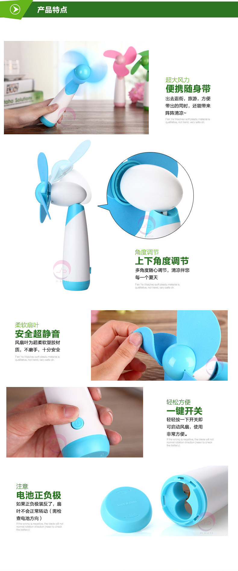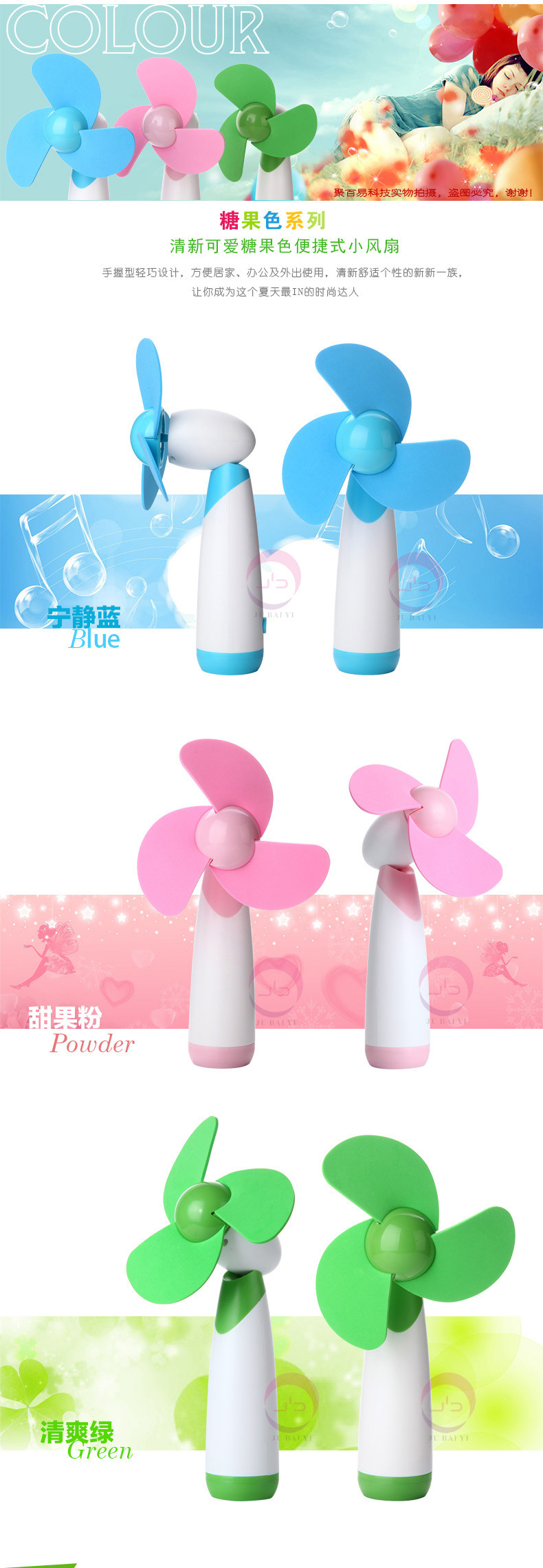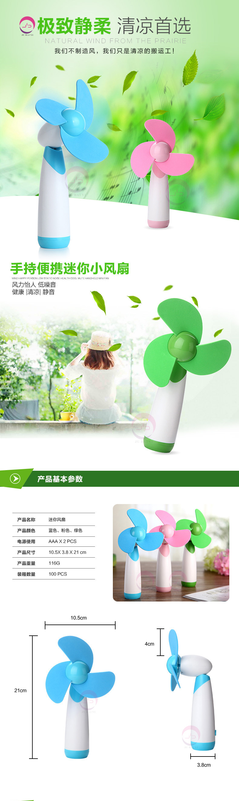 Product Name: Mini FanColor: blue, pink, greenPower: AAA * 2pcsProduct Dimensions: 10.5 * 3.8 * 21cmWeight: 116 g