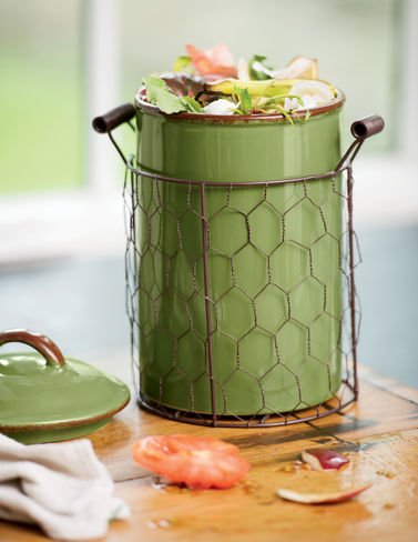 Studio : Gardener's Supply Company Publisher : Gardener's Supply Company Product Description Nestled in a chicken wire basket, this beautifully glazed crock looks right at home on your countertop. Only you will know it's there to collect fruit peels and vegetable scraps until it's time to bring them out to the bin. 0