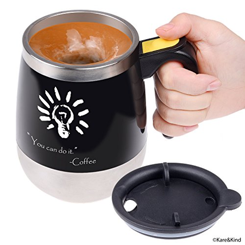 - This next generation self stirring mug is the best and easiest way to automatically stir your hot or cold drinks! The spill-free twist open/close lid allows you to take your drink from your kitchen to the living room, bedroom, car, office, gym, school, etc.