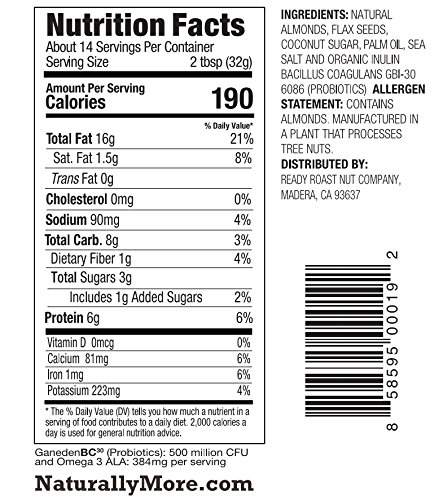 Nothing beats the taste of all natural almond butter, and with our New and Improved recipe with added Probiotics, it's Naturally More delicious and nutritious now! As always, we start with the freshest, highest quality California almonds and roast them to perfection. Then we add Probiotics and Flaxseed to provide more essential nutrients and energy for your busy life.