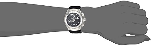Chronograph black dial with 30min sub dial with date display on a silver tone bezel, black rubber band, screw down crown