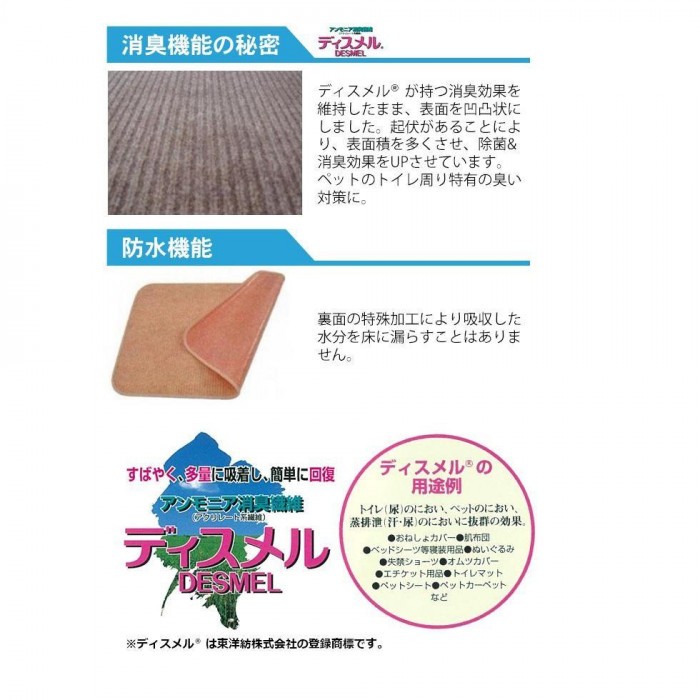 除菌力に優れた除菌繊維である「銀世界(R)」と、ペット臭やトイレなどのアンモニア臭を吸着し消臭する繊維である「ディスメル(R)」を使用したペット用マットです。裏面の特殊加工により、吸収した水分を床に漏らすことがありません。吸収・消臭効果は天日干しや洗濯によって回復、いつでも清潔な状態でお使いいただけます。 |