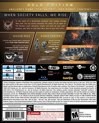 -. Feature : GUARANTEED BETA ACCESS - Pre-Order your copy of Tom Clancy's The Division for guaranteed Beta access. Beta starts in early 2016. / GOLD EDITION - Includes the game, Season Pass, and exclusive National Guard gear set. / SEAMLESS MULTIPLAYER: THE DARK ZONE - Collaborate with other players, or attack and steal their loot. / A LIVING, BREATHING WORLD - Use the environment for strategic advantages to dominate fights and ambush your enemies. / GEAR UP AND CUSTOMIZE YOUR AGENT - Customize your agent and your backpack. Level up your weapons, gear, and skills.