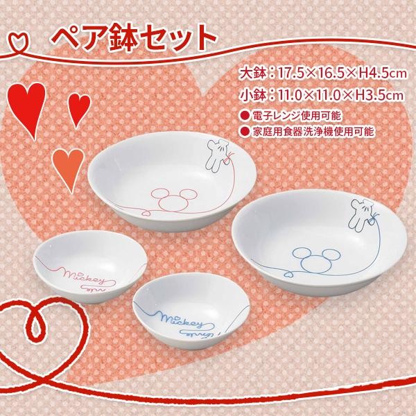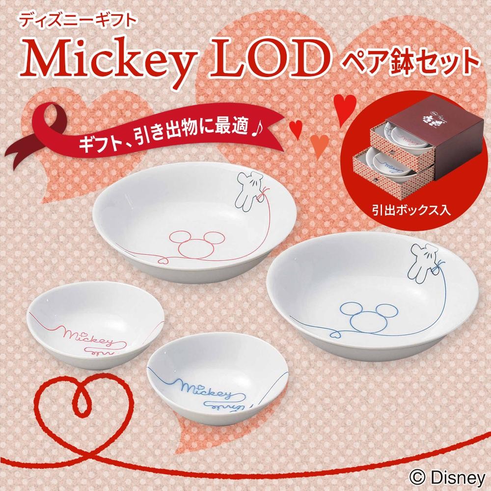 | 運命の糸がミッキーとミニー、二人の小指をつないでいるデザイン。結婚のお祝いなどに大変人気のシリーズ「MickeyLOD」。パッケージのデザインには、ミッキーフェイスが描かれています。 ペアで使っていただける大鉢と小鉢のセットです。 |