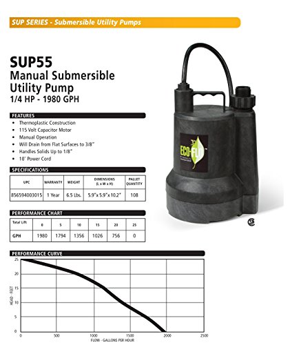 ECO-FLO Products SUP55 Manual Submersible Utility Pump, 1/4 HP, 1,980 GPH