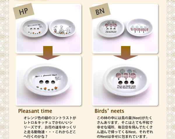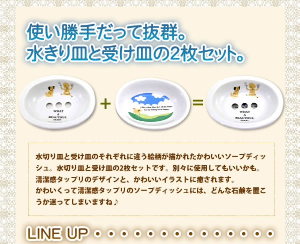 水切り皿と受け皿のそれぞれに違う絵柄が描かれたかわいいソープディッシュ。水切り皿と受け皿の2枚セットです。清潔感タップリのデザインと、かわいい、イラストに癒されます。