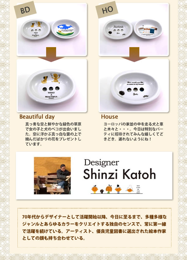 水切り皿と受け皿のそれぞれに違う絵柄が描かれたかわいいソープディッシュ。水切り皿と受け皿の2枚セットです。清潔感タップリのデザインと、かわいい、イラストに癒されます。サイズ/W14×D10.6×H4cm ※サプライヤー直送品  ご注文後、当日~1営業日後の出荷となります【商品名】Shinzi Katoh(シンジカトウ) ソープディッシュ BD