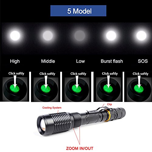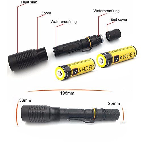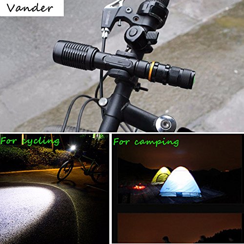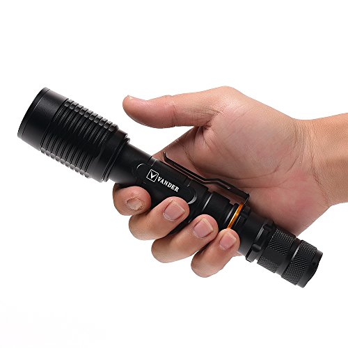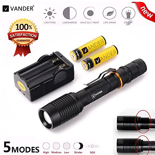 Vander 1000 Lumens T6 LED Zoomable Handheld Flashlight (Black,5 Modes with 18650 Charger and 2x Rechargeable Battery,Adjustable Focus Torch for Camping, Hiking, Hunting, Backpacking, Fishing and BBQ