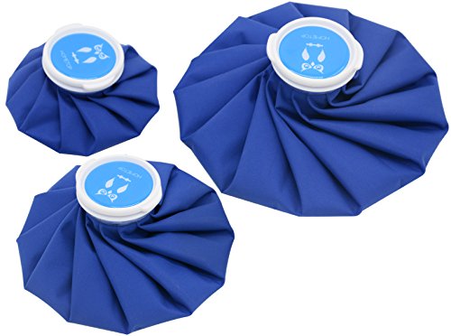 -. Feature : Package Included: 3 Bags - One Large (11"), One Medium (9"), One Small (6") / Superior leak resistant cap with large cap opening to allow for easy filling of ice cubes or crushed ice. / Made of waterproof soft touch rubberized fabric. Reusable and Economical. / Ideal for application of cold therapy to help reduce pain and swelling from minor scrapes, bruises, muscle aches, sprains and strains. Recommended to help relieve pain, reduce swelling, and speed recovery. Suitable for sport injury and first aid. / Stays cold much longer than gel packs or other cold packs.