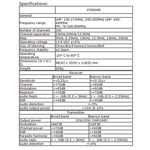 - CTCSS/DCS encoding and decoding. PC software programmable. Broadband (Wide)/Narrow band (Narrow) selectable. Frequency Step Selectable 5/6.25/10/12.5/25KHz. High/low power selectable. Function key guide voice (BEEP). Tri-color background light selectable
