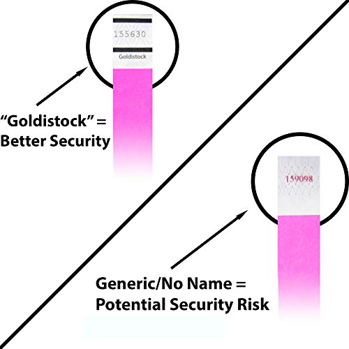 - Feature : GOLDISTOCK- THE "BETTER SECURITY" WRISTBAND. The "Goldistock" name printed on the wristband along with 2 distinctive thick black bands (see images) offers some protection from gatecrashers. Gatecrashers can buy generic/no name wristbands to get into your event. Generic/no name wristbands are readily available to any gatecrasher in big box, office supply, and party stores. / SECURITY FIRST. Goldistock wristbands have a strong, waterproof, adhesive closure including tamper-resistant security cuts. If an attendee attempts to remove the wristband the scored material rips making it very difficult to transfer. Individual colors will be sequentially numbered making them ideal for crowd control and keeping track of attendance. Numbers of different colored wristbands will NOT be in sequence. / PREMIUM GRADE TYVEK MATERIAL. Goldistock wristbands are manufactured in the USA with genuine Dupont Tyvek material. 100% Waterproof and durable. Stays on even if it gets wet. Does not stretch or tear. Sharpie friendly. One Size Fits All - 3/4" Wide x 10" Long. Fits on any size wrist from the smallest child to the largest adult. Wristbands come in sheets of 10. You get 20 sheets in all for a total of 200 wristbands. / IDEAL FOR ANY EVENT: Concerts, sporting events, parties, fairs, water & amusement parks, trade shows, conferences, school functions, seminars, and nightclubs. Nearly endless applications. / SECURITY TIP #1: Constantly rotate the color of wristbands you use. For example, using only neon green all the time is a security risk. SECURITY TIP #2: Specialty wristbands with "VIP", "General Admission", Happy Face" etc. offer even better security than plain color wristbands, and are easily visible even from a distance.