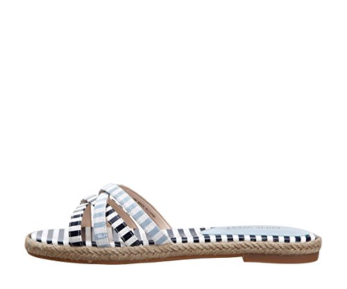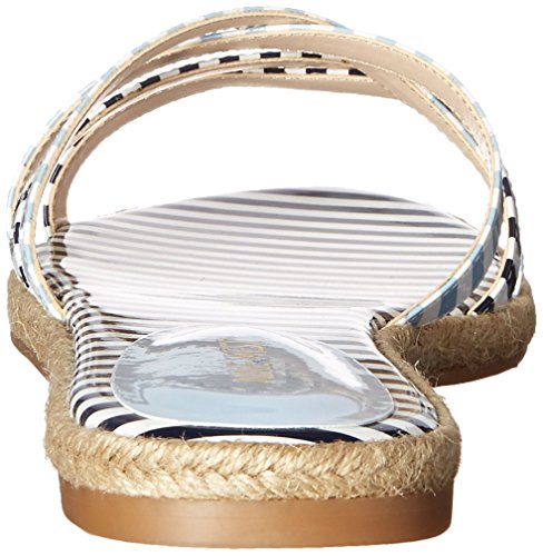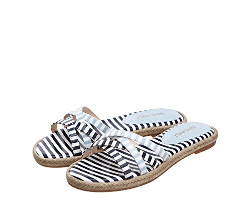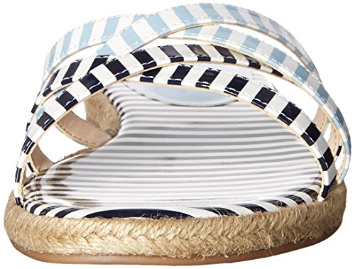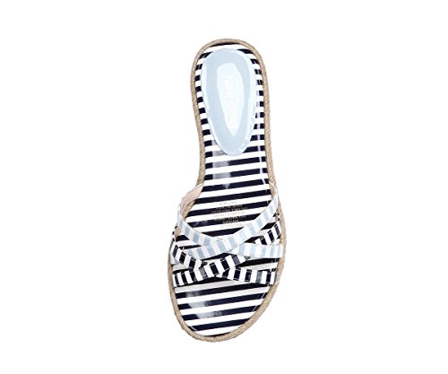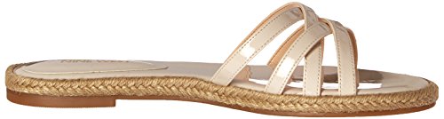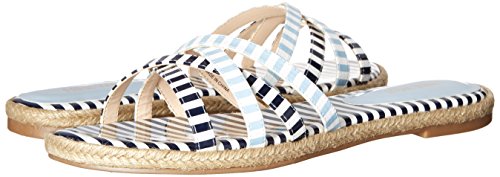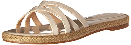 Flat sandal featuring crisscross toe straps and woven espadrille midsole