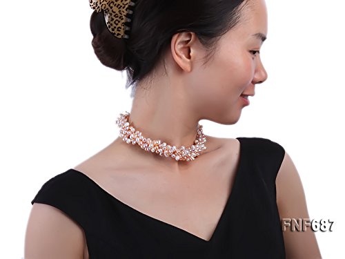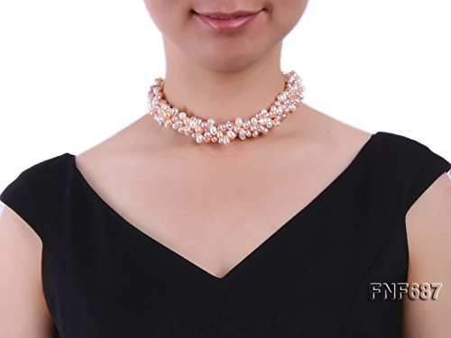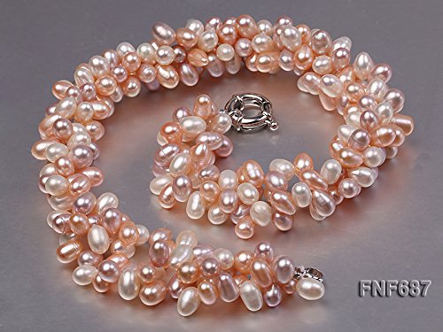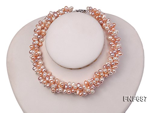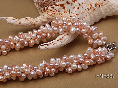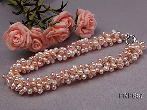 Description *This is a lovely three-strand necklace, set with 5x7mm white and pink cultured freshwater pearls that are side-drilled. The necklace is closed by a 15mm gilded moonlight clasp.