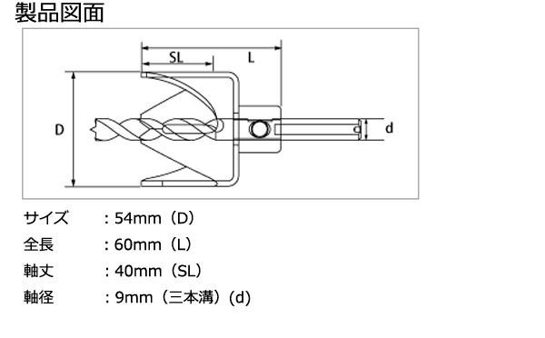 | 仕様 | 適用材:一般木材・堅木 適用機種:電気ドリル 適正回転数:3000回転/分以下 対応軸タイプ:三本溝 超硬チップ付 |