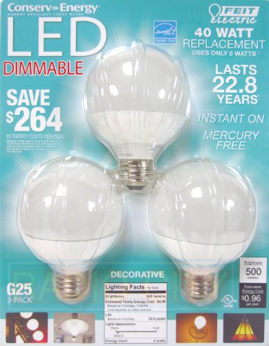 Feit Electric BPCEG25 Dimmable G25 Decorative Bulb, 11.1 x 8.7 x 3-Inches, White, Pack of 3