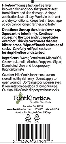 Studio : Foot Kinetics Publisher : Foot Kinetics Binding : Health and Beauty Product Description Hike Goo is specifically formulated to prevent blisters on feet. It provides an advanced friction barrier between the skin and sock that protects feet from blisters all day. High melting point waxes slow Hike Goo's absorption into the skin and create a protective layer that stays on the skin's surface. In wet conditions, typical when feet perspire, Hike Goo absorbs excess moisture and actually becomes "more slippery" and therefore more effective. Hike Goo stays on the skin's surface to provide all day protection from blisters, calluses, dry skin, and cracked heels. Hike Goo absorbs completely by days end and socks easily wash clean. 0