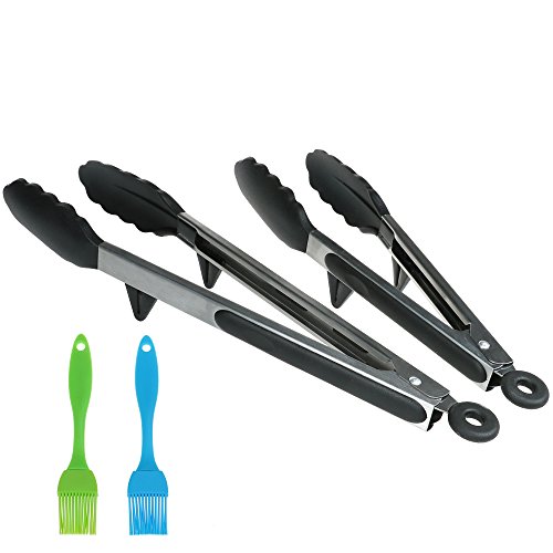 DINHAND Silicone Kitchen Tongs, Set of 2 Bundle 9 - 12 Inch with (2 Pack) Basting Brushes, Heavy Duty, Non- Stick, Stainless Steel Tongs for Barbecue, Grilling, Cooking