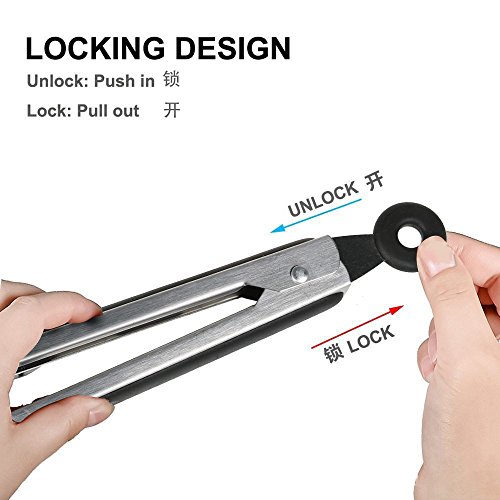 Safety lock design, locking mechanism and hanging loops for convenient storage, 0.8 inch stand Keeps the tips elevated to avoid contact with the surface so you can make sure the tongs head stays clean