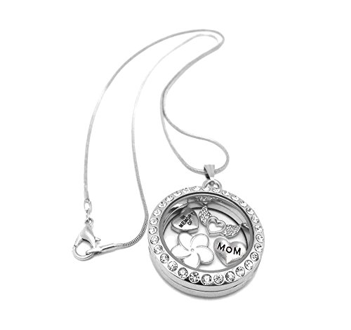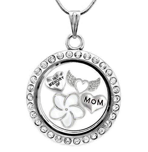 1 x 30mm Memory Locket Necklace With charms, including 18inch chain. Locket can be opened to add your own charms or small personal items . Charms included 'In Memory Of', 'Mom', white enamel flower and silver angel wings.Feature