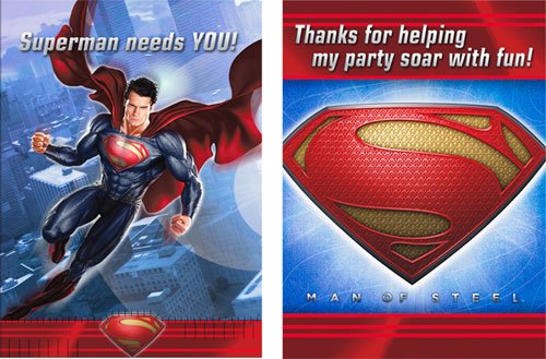 - Man of Steel Superman Invitations & Thank You Notes include: 8 Invitations (5 1/4in x 3 3/4in), 8 White envelopes, 8 Thank you postcards - (5 1/4in x 3 3/4in)
