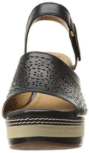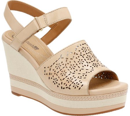 Update your look with this platform wedge sandal from the Clarks collection. Crafted of rich leather with contrast stitching accents and a lightweight fabric-covered wedge, it features adjustable buckled straps, fabric linings, an ortholite cushioned footbed, and a rubber outsole. Classic yet current, it adds instant height to sundresses, skirts, and cropped pants. Laser cutouts add a fun and unique twist.Feature