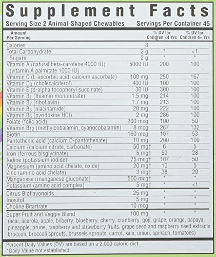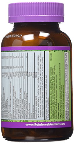 If children grew up in the rainforest, they'd get most of the nutrients for proper growth and development from whole foods like fruits, vegetables, whole grains and fish. Nutrients that are often missing from today's diets. Bluebonnet Super Earth Rainforest Animal Whole Food Based Multiple helps bridge this nutrient gap, providing important vitamins, minerals, super fruits and vegetables in two yummy animal-shaped chewable.Feature
