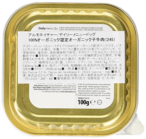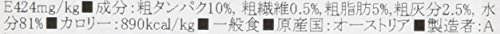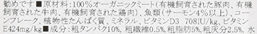 原材料:100%オーガニックミート(有機飼育された子牛肉4%以上、有機飼育された豚肉、有機飼育された牛肉、有機飼育された鶏肉)、コーンフレーク、植物性たんぱく質、ミネラル、ビタミンD3 709IU/kg、ビタミンE 425mg/kg