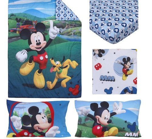 Studio : Franco Publisher : Franco Binding : Baby Product Product Description Come on in, the fun awaits with Disney Mickey Mouse Playhouse 4 Piece Toddler Bedding Set! This toddler-sized set includes a quilted comforter, fitted bottom sheet, flat top sheet and standard size pillowcase. The quilted comforter features everyone's favorite mouse Mickey and his best pal Pluto dancing down the street with the Mickey Mouse Club House in the distance. Turn the comforter back to reveal a fitted sheet with a popping blue-on-blue pattern of Mickey's iconic silhouette head and a crisp, white flat sheet print featuring Mickey in a variety of poses against a pattern of "MM" initials, silhouetted gloves, Mickey heads and more, in shades of dark blue, light blue, bright red and white. The Set includes: 1- Toddler Bed / Crib Size Comforter, 1- Flat Sheet, 1- Fitted Sheet and 1- Pillowcase BONUS HOMEMADE WAX MELT. 0