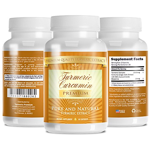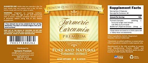 TURMERIC PREMIUM is manufactured in an FDA registered lab that is cGMP certified and complies with the US Pharmacopeia's qulity standards for quality & purity. Each capsule is 100% pure and contains no additional ingredient. It is 100% pure with no added fillers or binders. Each bottle includes 60 capsules, that is a full month supply. Made in USA