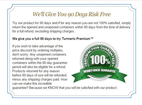 TRY RISK FREE - We're so confident that Turmeric Premium will work for you that we are offering a 90 day Money Back Guarantee! So, feel confident that TURMERIC PREMIUM will work, or your money back!